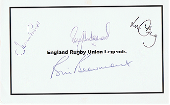 5"x8" Signed White Card signed by - J. Guscott, R. Underwood, W. Carling, B. Beaumont.