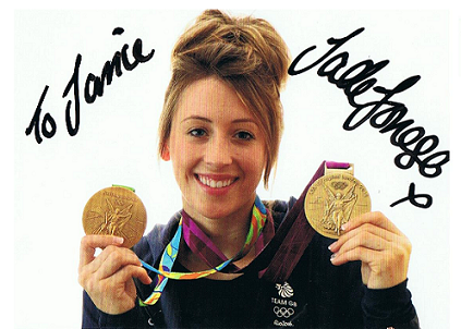 4" x 6" card signed 'to jamie' from Jade Louise Jones MBE who is a Welsh taekwondo athlete who represents Great Britain. She is the 2012 and 2016 Olympic gold medallist in the women's 57 kg category. In 2012, she won Britain's first taekwondo Olympic gold medal in this category.