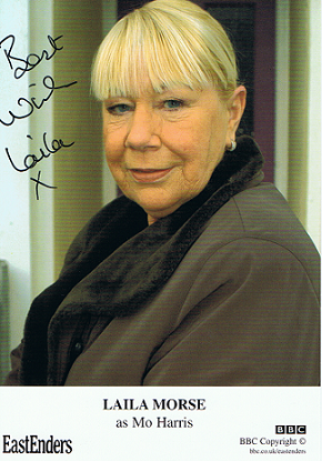 6"x4" photo signed by Laila Morse who plays Mo Harris in EastEnders. Please note: Where there is 1 or more of the same picture, the signature will vary from shown in the picture.