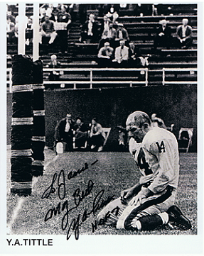 10"x8" card signed by Yelberton Abraham Tittle (born October 24, 1926), better known as Y. A. Tittle, who is a former football quarterback in the National Football League and All-America Football Conference who played for the Baltimore Colts, San Francisco 49ers, and the New York Giants. He was inducted into the Pro Football Hall of Fame in 1971.